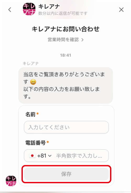 お名前とお電話番号を入力していただきましたら、赤丸の『保存』をタップ。